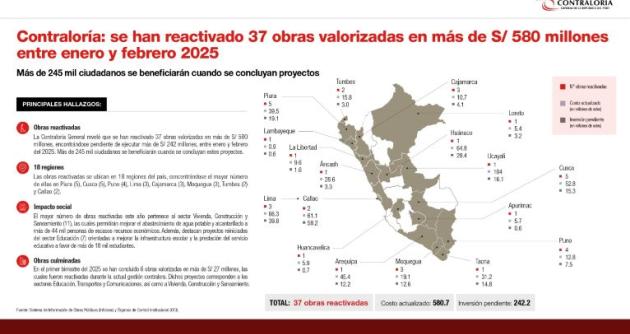 Chimbote en Línea.-La Contraloría General reveló que, entre enero y febrero del 2025, se han reactivado 37 obras públicas, las cuales están valorizadas en más de S/ 580 millones, encontrándose pendiente de ejecutar más de S/ 242 millones, de acuerdo con la información registrada por las mismas entidades en el Sistema de Información de Obras Públicas (Infobras) y lo recopilado por los Órganos de Control Institucional (OCI), por lo que más de 245 mil ciudadanos se beneficiarán cuando concluyan estas obras.