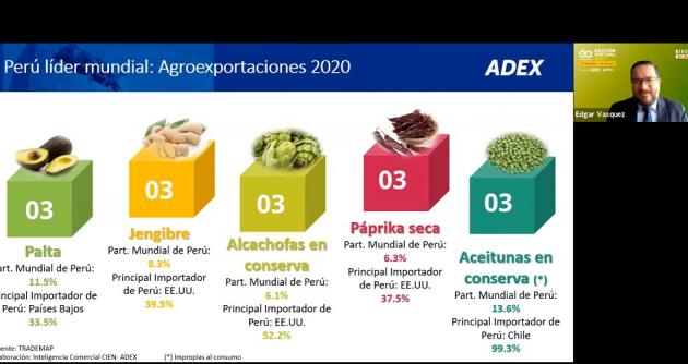 Chimbote en Línea.- La Expoalimentaria virtual 2021, a realizarse en la plataforma B2Perú del 30 de septiembre al 8 de octubre, es una importante herramienta que ayudará a la mayor exportación de alimentos y posicionamiento del Perú como un proveedor confiable, gracias al trabajo conjunto entre los sectores público y privado, manifestó el presidente de la Asociación de Exportadores (ADEX), Erik Fischer Llanos.