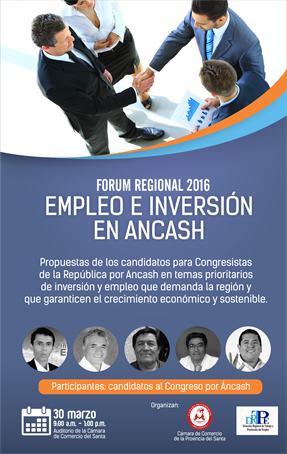 Chimbote en Línea.- La Cámara de Comercio y Producción del Santa y el Consejo Regional de Trabajo y Promoción del Empleo de Áncash anunciaron la realización del fórum Empleo e Inversión en Áncash; con la participación de un grupo de candidatos al Congreso de la República por la región Áncash.