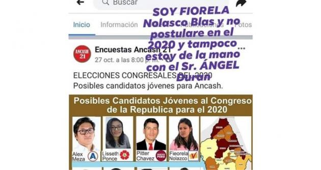 Chimbote en Línea.- A través de un comunicado emitido en su red social de Facebook, Fiorela Nolasco Blas, hija del exconsejero regional de Áncash, Ezequiel Nolasco Campos, denunció que algunas páginas estarían utilizando su imagen y asociándola a un partido político, tratando de hacer creer a la población que ella sería candidata en estas elecciones congresales.