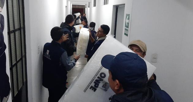Chimbote en Línea.- En total 828 cajas conteniendo material de sufragio que serán utilizadas en las elecciones del 26 de enero próximo llegaron a la sede de la Oficina Descentralizada de Procesos Electorales - ODPE Huaraz, la noche de ayer.