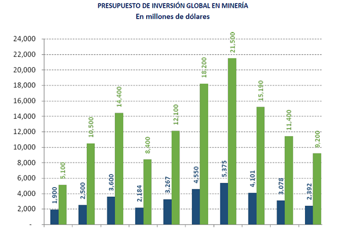 El último informe Tendencias de SNL Metales y Minería, revela que el sector de exploración global continúa luchando contra fuertes vientos de mercado en contra. Para el 2015 estima que el presupuesto para inversiones ascendería a US$ 9,200 millones, menos de la mitad de lo que se registró en el 2012, cuando llegó a US$ 18,200 millones. Regularmente, América Latina recibe de dicho monto el 26% de total, estimándose que Perú recibió el 5%7.