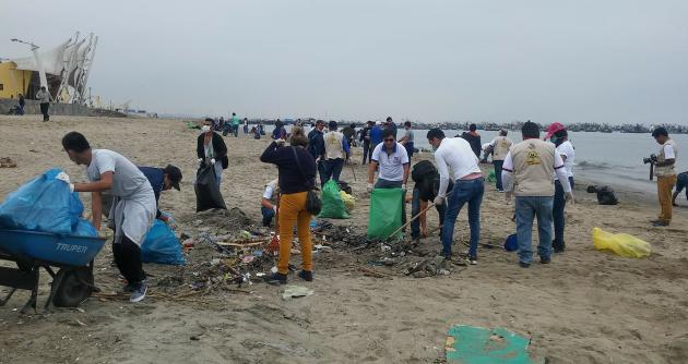 Unos 80 servidores portando bolsas, palas carretillas, escobas y recogedores llegaron a esta parte de la bahía para recoger los desperdicios: botellas de plástico, pedazos de redes, sogas, madera. La jornada contó con el apoyo de la Municipalidad Provincial del Santa, donde el personal de limpieza se encargó de retirar la basura acumulada.