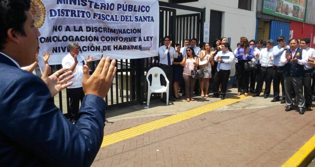 Chimbote en Línea.- En su sexto día de ‘huelga blanca’ los Fiscales Provinciales Titulares, Adjuntos Superiores y Adjuntos Provinciales del Ministerio Público del Santa realizaron un plantón para exigir que se atienda el pedido de homologación de sus remuneraciones.