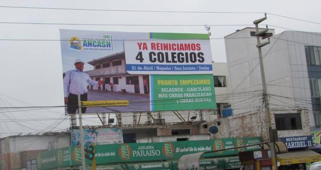 Se trata de un cartel instalado por el Gobierno Regional de Áncash (GRA) a fin de promocionar cuatro obras reiniciadas en instituciones educativas de Chimbote, Nepeña, San Jacinto y Jimbe, pero hasta ahí todo bien, lo peculiar fue que el letrero lleva la imagen del gobernador, Luís Gamarra Alor.