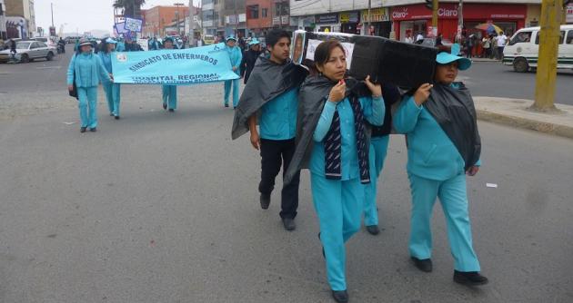 Chimbote en Línea (Locales) En su treceavo día de huelga indefinida, las enfermeras no dudaron en cargar en sus hombros un ataúd y recorrer por las principales calles de Chimbote, protestando en contra del Gobierno Central, porque hasta hoy no ha cumplido con mejorar su escala salarial y otros pedidos.