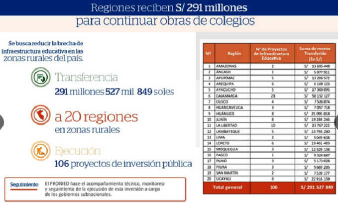 Esta cifra ha sido transferida, en el transcurso del presente año, a las autoridades de los gobiernos regionales y locales para que sigan con los trabajos de 106 proyectos de inversión pública en infraestructura educativa.