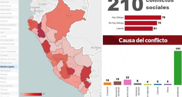 Respecto a la distribución territorial de los conflictos reportados, Apurímac continúa concentrando la mayor cantidad de casos que se desarrollan en una sola región (24 casos), seguida de Áncash (22) y Puno (18). En cuanto a la tipología, los casos socioambientales continúan siendo los más numerosos (71,1%). En relación a actividades extractivas vinculadas a conflictos, la minería continúa siendo la que se relaciona con más casos socioambientales (62% de los casos socioambientales).