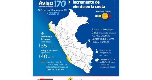 Chimbote en Línea.- Desde mañana martes 18 al jueves 20 de agosto, se prevé el incremento del viento en la Costa, con velocidades por encima de los 35 kilómetros por hora y ráfagas superiores a los 40 kilómetros por hora.