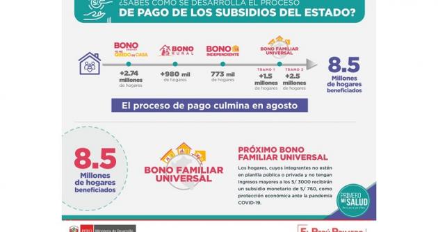 Chimbote en Línea.- Con el proceso de pago del tramo 2 del Bono Familiar Universal (BFU), que se inició el martes último y que beneficia a 2.5 millones de hogares, el Estado Peruano, a través del Ministerio de Desarrollo e Inclusión Social (MIDIS) y del Ministerio de Trabajo y Promoción del Empleo (MTPE), completa la entrega del subsidio de S/ 760 a 8.5 millones de hogares en el marco de la emergencia sanitaria decretada por el Ejecutivo debido a la pandemia del coronavirus.