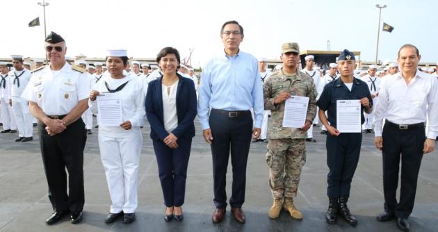 Junto al titular de Defensa, Walter Martos, la ministra Cáceres acompañó esta mañana al presidente Martín Vizcarra en la ceremonia de entrega de estos certificados a miembros del servicio militar voluntario de las Fuerzas Armadas.