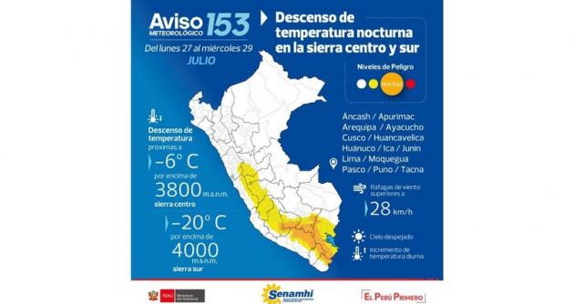 Asimismo, se estima temperaturas por debajo de -6 grados Celsius en localidades por encima de los 3800 metros sobre el nivel del mar (m.s.n.m) en la sierra centro.