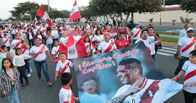 Niños, jóvenes y  adultos provistos con  camisetas de la selección peruana se dieron cita desde las cuatro de la tarde, donde además participó el alcalde sureño, Valentín Fernández Bazán quien acompañó con arengas junto a los asistentes.