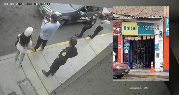 El hecho delictivo fue grabado por las cámaras de seguridad del local, en las imágenes se ve a un delincuente en la parte de afuera del agente haciendo de campana; mientras que al interior los otros dos maleantes cometían su fechoría.