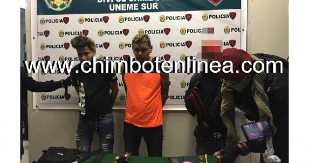 Los agentes policiales del Escuadrón de Emergencia UNEME SUR atraparon a estos sujetos que habían asaltado a una mujer para robarle su celular en la intersección con el jirón Libertad en el pueblo joven Villa María de Nuevo Chimbote.