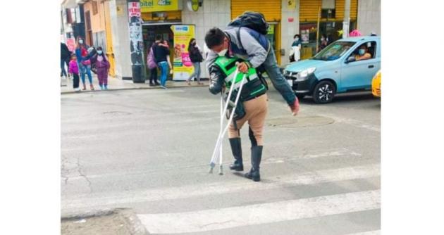 En la imagen se aprecia al ejemplar policía cargando a un hombre que usaba muletas para que pueda cruzar la vía.