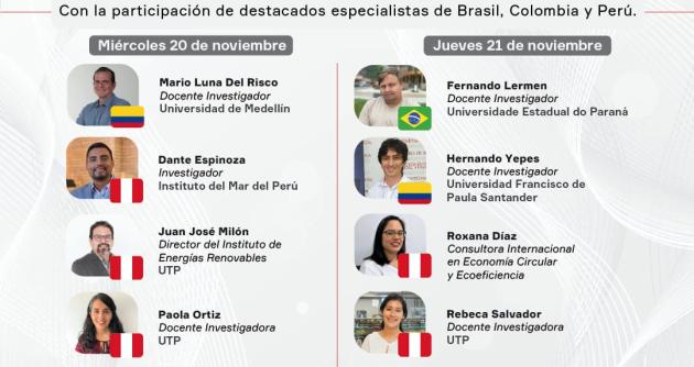 El evento contará con la participación de investigadores internacionales como Mario Luna, de la Universidad de Medellín (Colombia); Alexander Yepes, de la Universidad Francisco de Paula Santander (Colombia); y Fernando Lermen, de la Universidade Estadual do Paraná (Brasil). Además, participará Dante Espinoza, investigador del Instituto del Mar del Perú; y Juan José Milón, director del Instituto de Energías Renovables de la UTP, además reconocidos expertos nacionales.