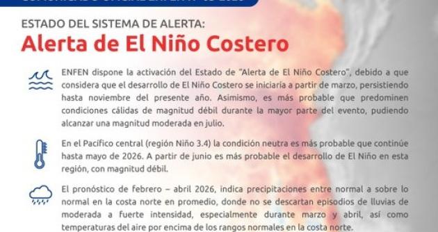 Chimbote en Línea.- La Comisión Multisectorial del Estudio Nacional del Fenómeno El Niño (Enfen) advierte que el desarrollo de El Niño costero empezaría a partir de marzo y persistiría hasta noviembre, por lo que dispuso la activación del estado de alerta de El Niño costero.
