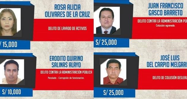 Juan Gasco es investigado por el presunto delito de colusión agravada y José Del Carpio tiene una sentencia de seis años de cárcel por el delito de colusión desleal, por cada uno se ofrece una recompensa de 25 mil soles.