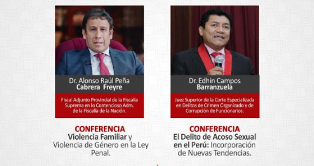 El viernes 6 de setiembre iniciará la capacitación a las 4:30 p.m. el Dr. Alonso Raul Peña Cabrera Freyre; Fiscal Adjunto Provincial de la Fiscalía Suprema en lo Contencioso Administrativo de la Fiscalía de la Nación, docente de posgrado de la Universidad Nacional Mayor de San Marcos, docente de la Academia de la Magistratura, investigador y autor de diversas publicaciones y conferencista. Peña Cabrera abordará el tema Violencia General y Violencia de Género en la Ley Penal.