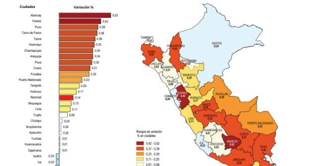 Luego, siete ciudades registraron las menores variaciones positivas por debajo del 0,10%, en la zona norte: Trujillo 0,08%, Chiclayo 0,03%, Moyobamba 0,02%, Cajamarca y Tumbes con 0,01% en cada una; y en la sierra: Ayacucho y Huancavelica con 0,02% y 0,01%, respectivamente. En el mes de análisis solo tres ciudades presentan resultados negativos: Ica e Iquitos con -0,03%, cada una, y Chimbote con -0,04%. (Nota de prensa Fuente INEI)