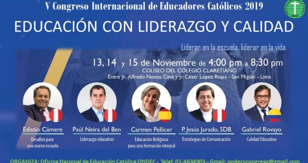 Chimbote en Línea.- Del 13 al 15 de noviembre, la Oficina Nacional de Educación Católica (ONDEC) llevará a cabo el V Congreso Internacional de Educadores Católicos: “Educación con Liderazgo y Calidad” en el Coliseo del Colegio Claretiano en San Miguel, Lima.