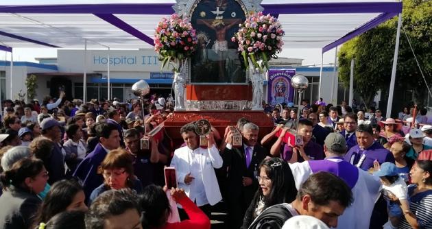 En su ingreso al Hospital III, la venerada imagen fue recibida por una multitudinaria feligresía que participó devotamente en una misa realizada en el frontis del nosocomio. El Cristo Morado bendijo a los pacientes y trabajadores en medio de cánticos y oraciones que realizaban los cientos de fieles que acompañaban a la venerada imagen.