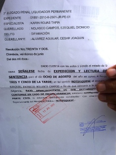 La sentencia será leída el próximo 8 de agosto en el Segundo Juzgado Penal Liquidador Permanente de Nuevo Chimbote a las 3 y 35 de la tarde. El viernes fueron notificadas ambas partes para acudir a la cita.