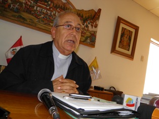 Exigió resultados a la policía, que frene la ola de violencia30/07/2012 (Chimbotenlinea.com).- El obispo de la Diócesis de Chimbote, monseñor Ángel Francisco Simón Piorno, expresó su pesar por la muerte del niño Manuel Lezcano Castillo y reclamó a las autoridades acabar con el “chalequeo” en las obras. (Foto Lindberg Cruzado)