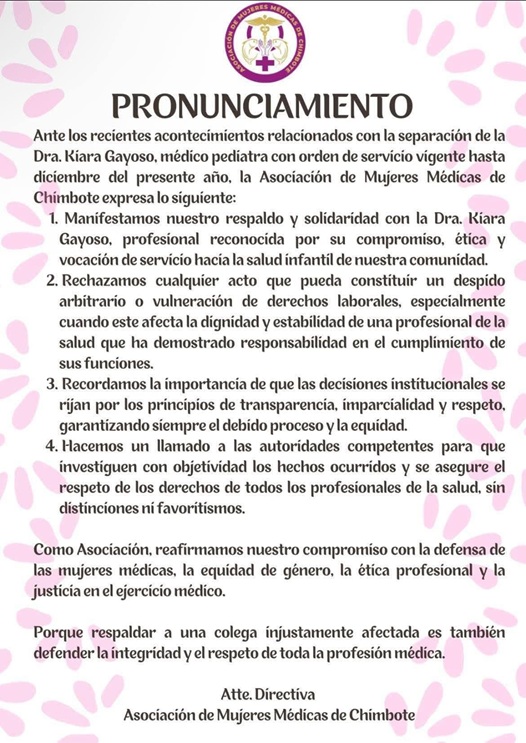“Respaldar a una colega injustamente afectada es también defender la integridad y el respeto de toda la profesión médica”, concluye el pronunciamiento firmado por la directiva de la Asociación de Mujeres Médicas de Chimbote.