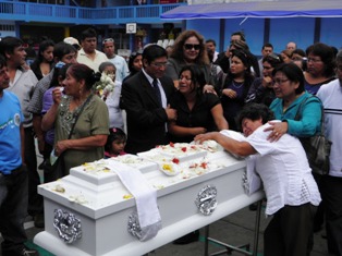 30/07/2012 (Chimbotenolinea.com ).- Desgarradoras escenas de dolor protagonizaron hoy la madre, familiares y compañeros de escuela, del pequeño Manuel Lescano Ancajima, de 8 años, quien es una víctima más de la violencia y la inseguridad que se vive en nuestra ciudad. Manuelito, fue un niño muy amado, y eso se pudo comprobar esta mañana durante el homenaje que sus amigos y profesores le rindieron en el colegio Antonio Raimondi. (Fotos: Lindberg Cruzado)