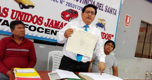 Chimbote en Línea. – El presidente de la Asociación Fondo Central de Transportistas de la Provincia del Santa, Líder Saavedra Paredes, presentó hoy los planillones que han adquirido para iniciar la recolección de 10 mil firmas que presentarán al Tribunal Constitucional para demandar la inconstitucionalidad de la ordenanza municipal 024-2016-MPS, que establece mayores sanciones y multas a los transportistas.