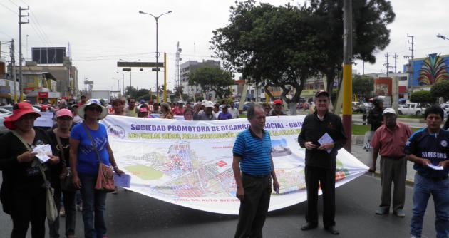 Portando una gigantografía los manifestantes se congregaron en la parroquia Perpetuo Socorro para dirigirse hasta el frontis de la Municipalidad Provincial del Santa, a fin de hacerle recordar al alcalde Julio Cortez Rojas que estos terrenos de 10 hectáreas fue aprobado por la oficina de Infraestructura del Ministerio de Salud y por ende es necesario su pronta construcción.