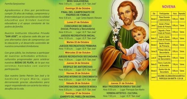 Actividades que se dio inicio el día miércoles 16 de octubre con la novena a nuestro Santo Patrón San José con la participación de la plana docente y administrativa y que culmina el 2 de noviembre con el baile de fraternidad amenizada por la Orquesta Amaya Hermanos en Salón y Recepciones Marfest.