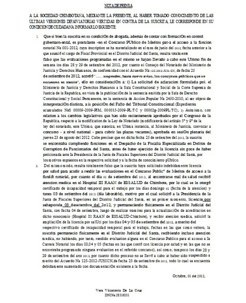 Jeny Vilcatoma reconoció que se presentó a un concurso público para ser notaria, pero según su carta aclaratoria lo hizo en junio pasado, antes de que se integre a la Fiscalía Anticorrupción del Distrito Judicial del Santa.