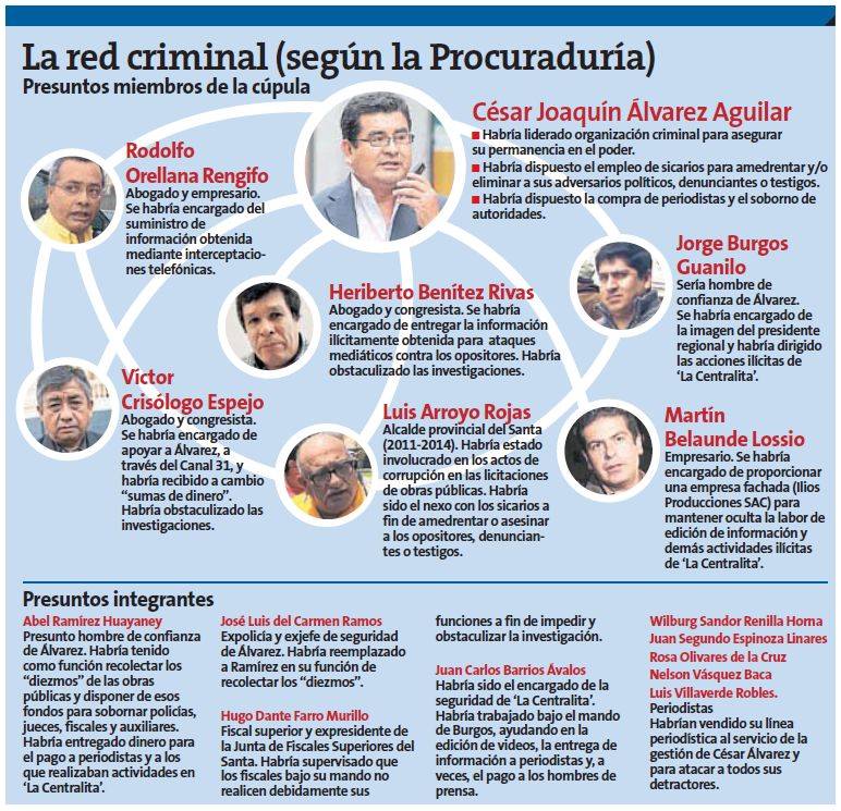 La cúpula estaría conformada por el alcalde del Santa, Luis Arroyo Rojas; los congresistas Heriberto Benítez Rivas y Víctor Crisólogo Espejo; el abogado Rodolfo Orellana Rengifo; el empresario Martín Belaunde Lossio, y Jorge Burgos Guanilo, encargado de la imagen del titular ancashino.