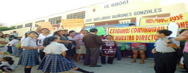 Chimbotenlinea.com (Por Cintia Cabrera).-Primer día de clases en crisis. Los alumnos del colegio José Abelardo Quiñones, ubicado en Nuevo Chimbote, se quedaron con cuadernos y mochilas en mano luego de que un grupo de madres de familia se apostaron en el frontis de la institución para impedir el ingreso de los escolares y exigir la continuidad de la docente Madeleine Arroyo Rosales, como directora del plantel.