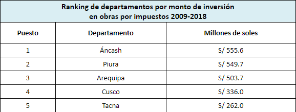 Chimbote en Línea.- Proinversión ha publicado su reporte de inversión en obras por impuestos (OxI) desde la creación de este mecanismo, en el año 2009, hasta la fecha. En este informe se ubica a la región Áncash en primer lugar, con una inversión de S/ 555.6 millones, seguida por Piura (S/ 549.7) y Arequipa (S/ 503.7 millones).