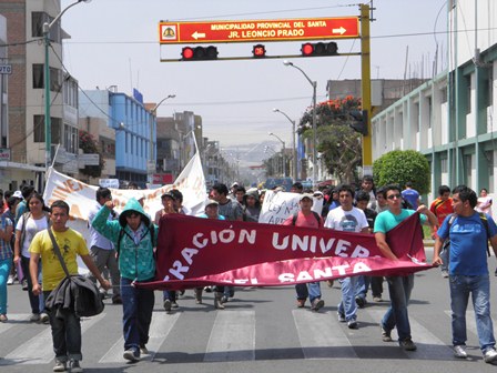 Los estudiantes de la Universidad Nacional del Santa llevan ya varios días protestando en contra del artículo 7 de la Ley 29914, porque consideran que es el camino a la privatización de estas casas superiores de estudios.