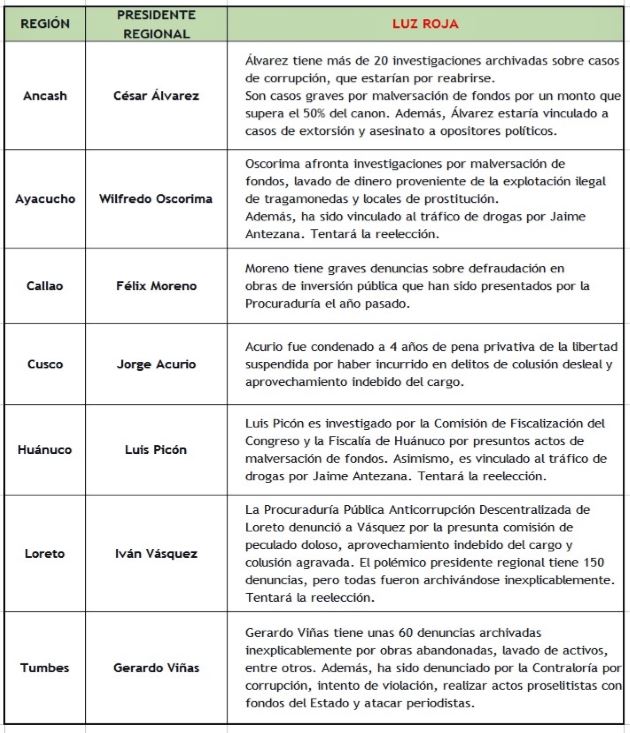 Chimbote en Línea (Por: Otra mirada) A propósito de las elecciones regionales y municipales de octubre próximo, la situación de ingobernabilidad en varias regiones del país se torna preocupante por las graves acusaciones en los que se ven envueltos los Presidentes Regionales. Hablamos de denuncias de alto calibre, que van desde amenazas, extorsiones, actos de corrupción, hasta la vinculación con el asesinato de opositores políticos. A continuación, un mapa de los casos más graves.