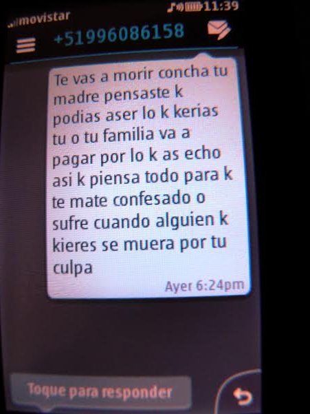 Asmat informó a la policía que el sujeto lo llamó del teléfono celular N° 996086158 y de ese mismo equipo le envío el siguiente mensaje de texto: “Te vas a morir con… pensante que podías hacer lo que querías, tú o tu familia van a pagar por lo que has hecho, así que piensa todo para que te mate confesado o sufre cuando alguien que quieres se muera por tu culpa”. (Por: Lindberg Cruzado)