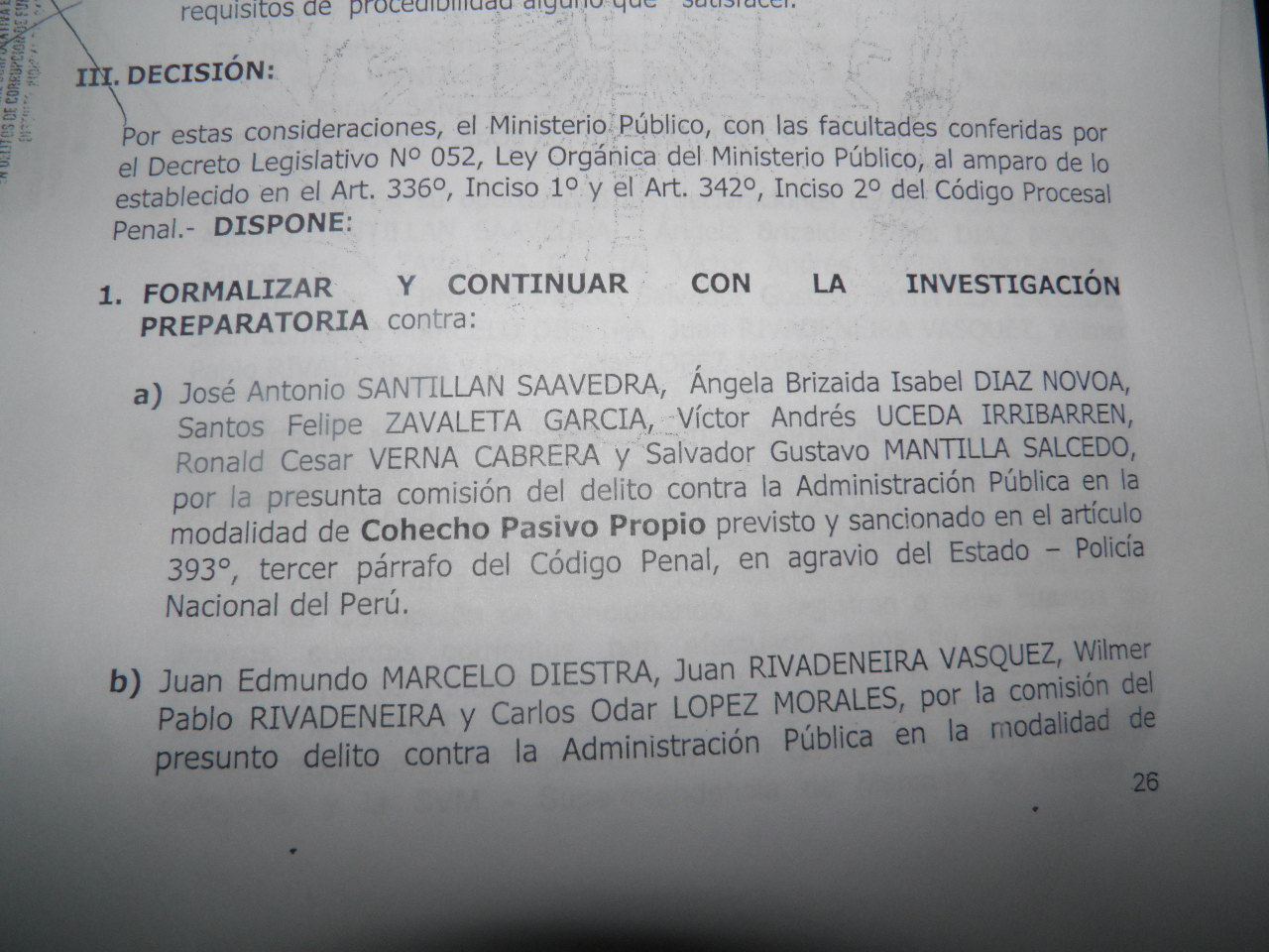 En un informe al que tuvo acceso Chimbotenlinea.com, se detalla la disposición del fiscal Laureano Añanca Chumbe, contra los agentes de la Policía Nacional, que detallamos a continuación: Víctor Andrés Uceda Irribarren, Salvador Gustavo Mantilla Salcedo, José Antonio Santillán Saavedra, Santos Felipe Zavaleta García, Ronald César Verna Cabrera, y Ángela Isabel Díaz Novoa; a todos ellos se les acusa de los delitos de Cohecho Pasivo Propio y Asociación Ilícita para Delinquir.
