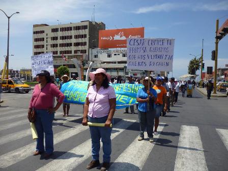 Chimbotenlinea.com (Por Leidy Cobeñas).- Cerca de 14 asociaciones de posesionarios de las tierras del Proyecto Especial Chinecas realizaron una movilización para exigir al Gobierno Regional de Ancash(GRA)se les entregue la certificación como propietarios de los terrenos que invadieron hace más de 10 años.(Foto Leidy Cobeñas)