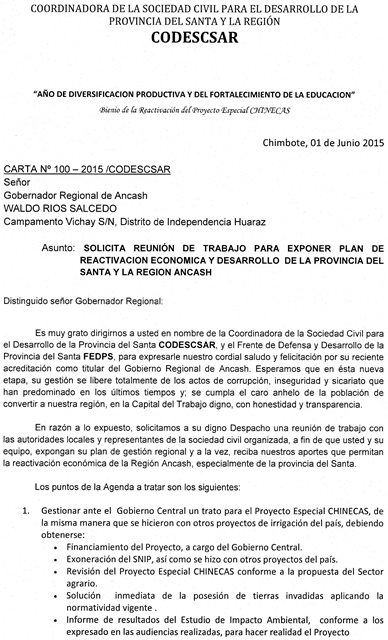 Chimbote en Línea.- La Coordinadora de la Sociedad Civil para el Desarrollo de la Provincia del Santa y la Región (Codescsar) a través de una misiva solicitó hoy al gobernador regional de Áncash, Waldo Ríos Salcedo, una reunión de trabajo para exponer el plan de reactivación económica y de la provincia del Santa y la región.