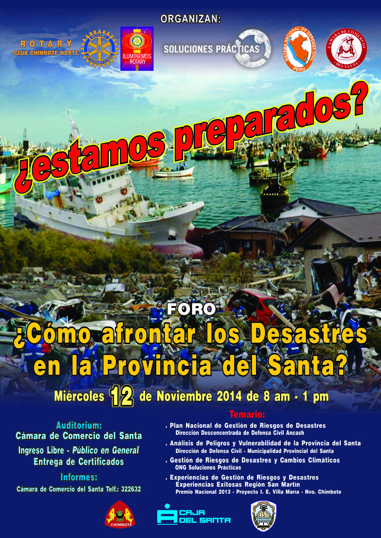 Chimbote en Línea.- La Cámara de Comercio y Producción de la Provincia del Santa en alianza con la Dirección Desconcentrada de Defensa Civil- Ancash, Rotary Club Chimbote Norte y la ONG Soluciones Prácticas, realizarán el Foro ¿Cómo afrontar los desastres en la Provincia del Santa?.