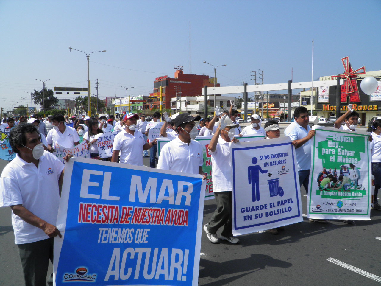 Portando gigantografías, guantes y mascarillas en el rostro los protestantes pidieron a las autoridades y a la ciudadanía dejar de contaminar la bahía, ya que este constituye una gran recurso natural que tenemos los chimbotanos.