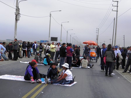 Hombres y mujeres desfilaron desde las 9 a.m. por la Panamericana Norte y se concentraron en el puente Lacramarca bloqueando esta principal vía y causando caos en el transporte.