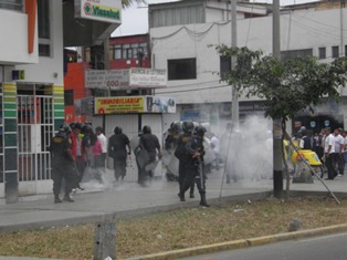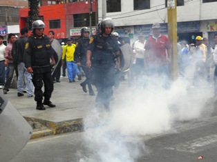 Nuevamente el escenario de la trifulca fue la intersección de las avenidas José Pardo y José Gálvez. Al mediodía los agentes del orden reventaron varias bombas lacrimógenas que no solo corrió a los docentes, sino también afectaron a los transeúntes y comerciantes de los mercados Nuevo Progreso y Chacra a la Olla.
