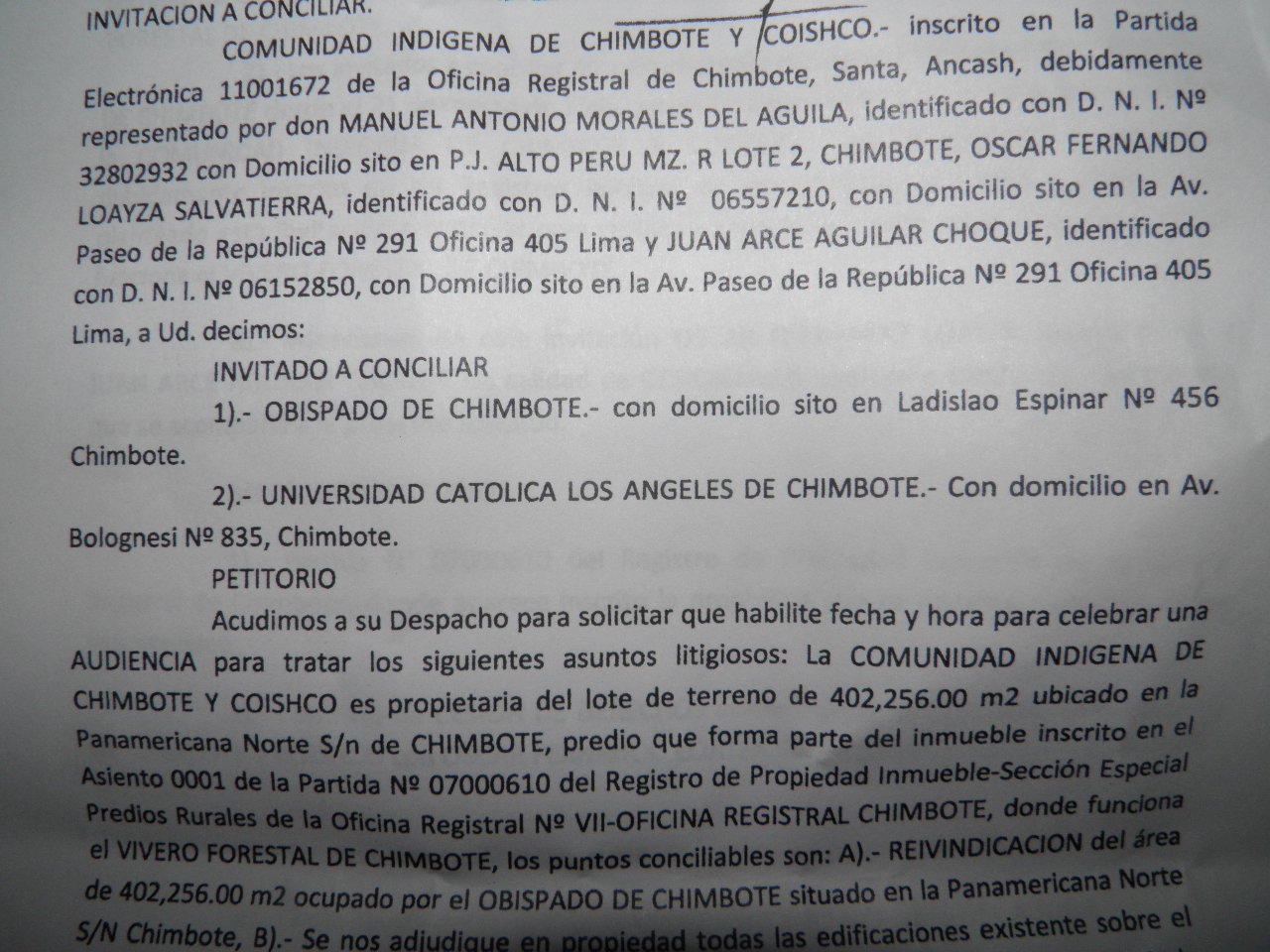 Par el pedido la supuesta comunidad manifiesta que desde el año 1954 son dueños de estos terrenos, según ellos inscrito en Registros Públicos y que por ello los entregaron a los abogados mencionados líneas arriba.