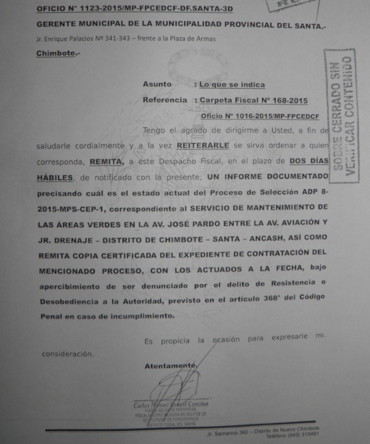 Esto luego de que el funcionario edil a la fecha no habría remitido al despacho fiscal el informe del estado actual del proceso de selección de ADP 8-2015 correspondiente al servicio de mantenimiento de las áreas verdes en la avenida José Pardo, entre la avenida Aviación y el jirón Drenaje; asimismo no remitió la copia certificada del expediente de contratación del mencionado proceso.
